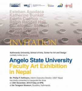 Kathmandu University, School of Arts, Center for Art and Design cordially invites you the Angelo State University Faculty Art Exhibition in Nepal Mr. Phillip P. Hoffman, Interim Executive Director, USEF Nepal kindly consented to inaugurate the exhibition on 25th November, …