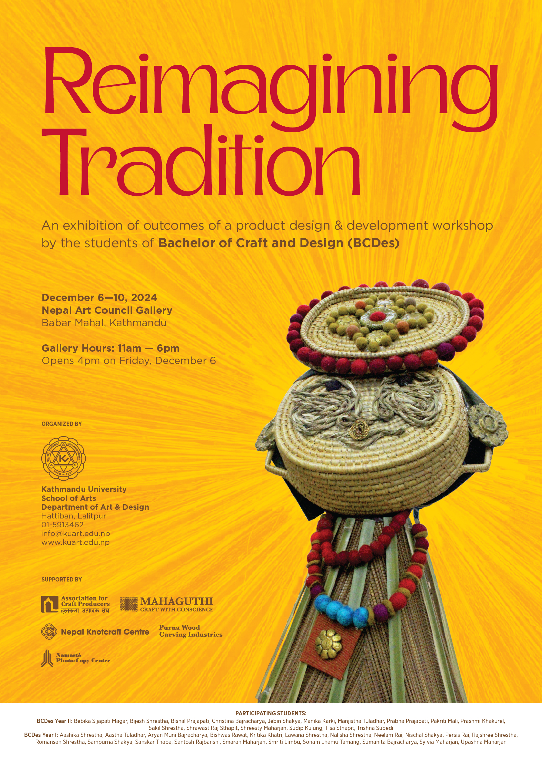 We are thrilled to announce “Reimagining Tradition”, an extraordinary exhibition that highlights the creative outcomes of a 10-day workshop by the students of Bachelor of Craft and Design on Product Design and Development. This workshop explored the fusion of Nepali traditional materials with contemporary design sensibilities, facilitated by Mr. Mike Krajniak.