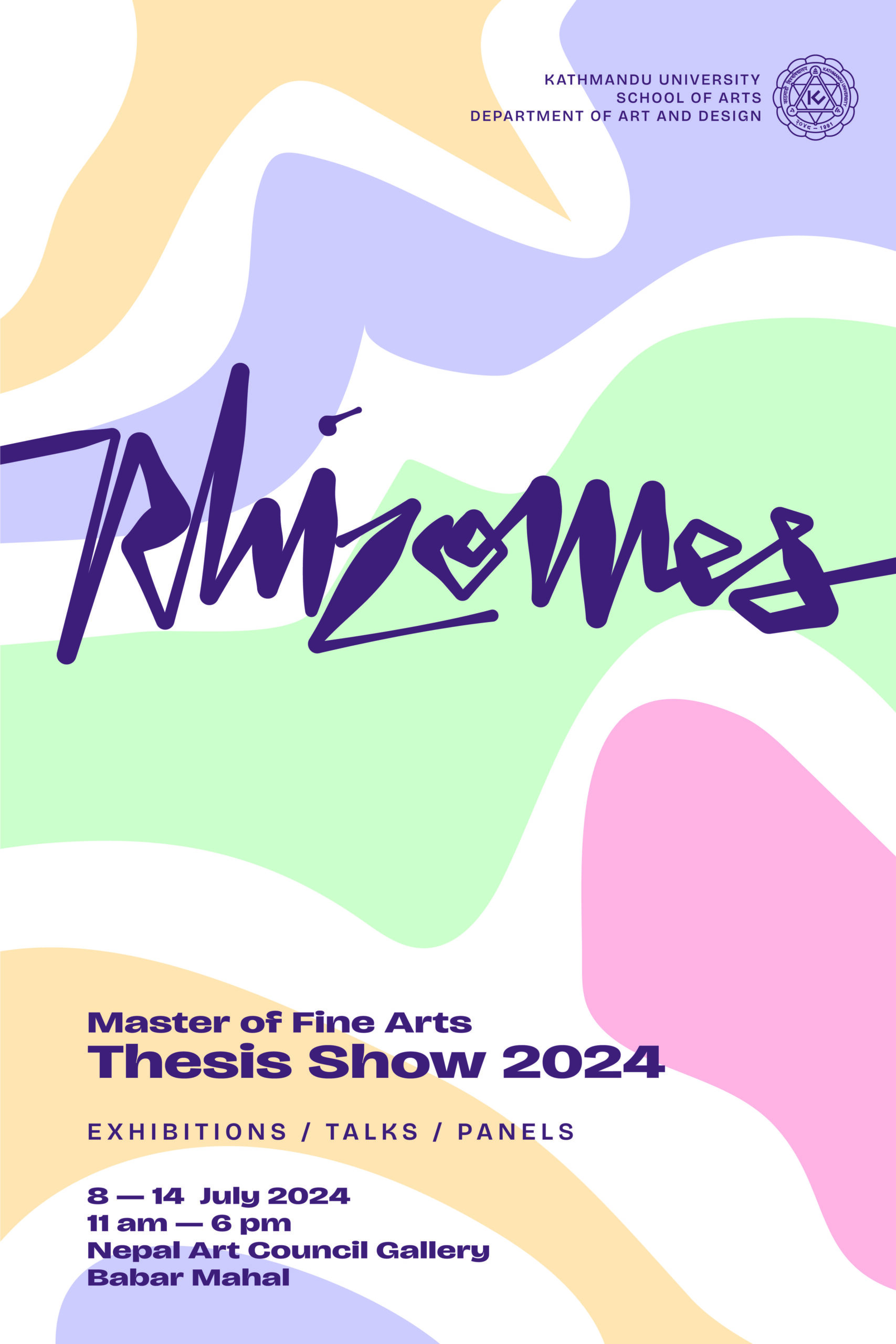 Kathmandu University, School of Arts, Department of Art and Design invites you to the opening of RHIZOMES: MFA Thesis Show at Nepal Art Council Gallery, Babar Mahal, Kathmandu on Monday 5: 30 PM, 8 July 2024.