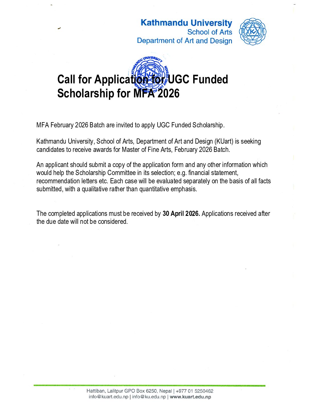 UGC Formula Funding Scholarship for MFA 2026 Batch Scholarship Notice Download Application Form Share: Gopal Magar
